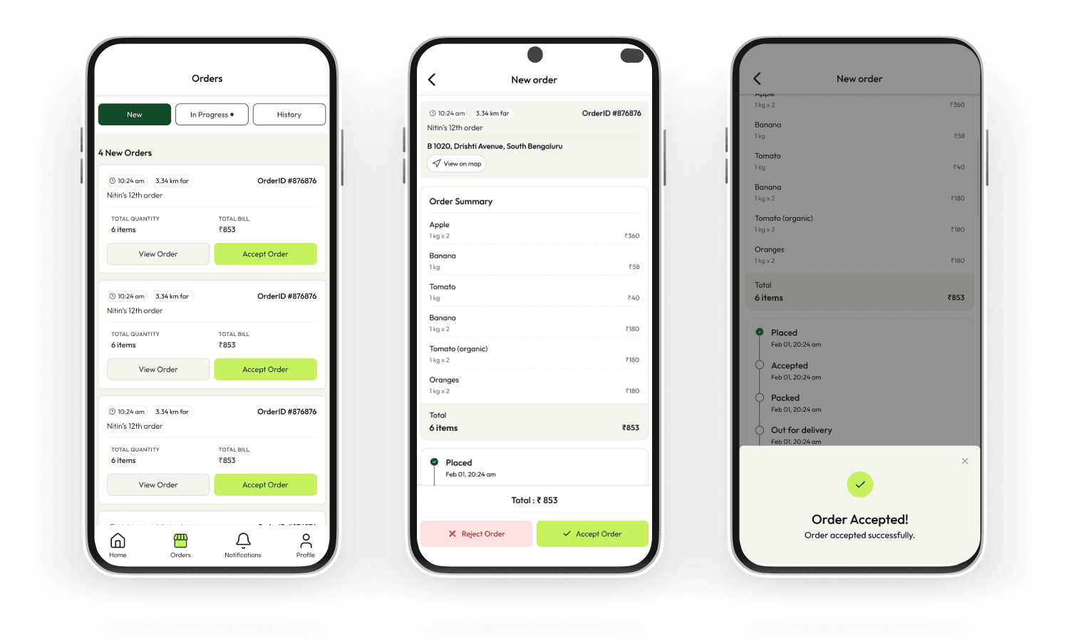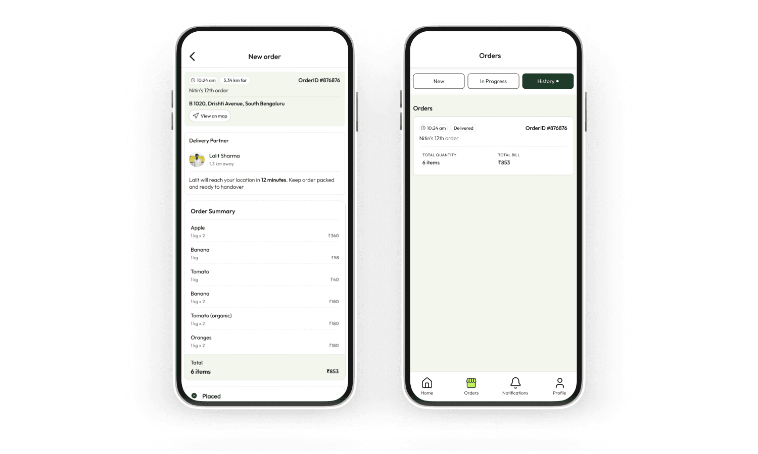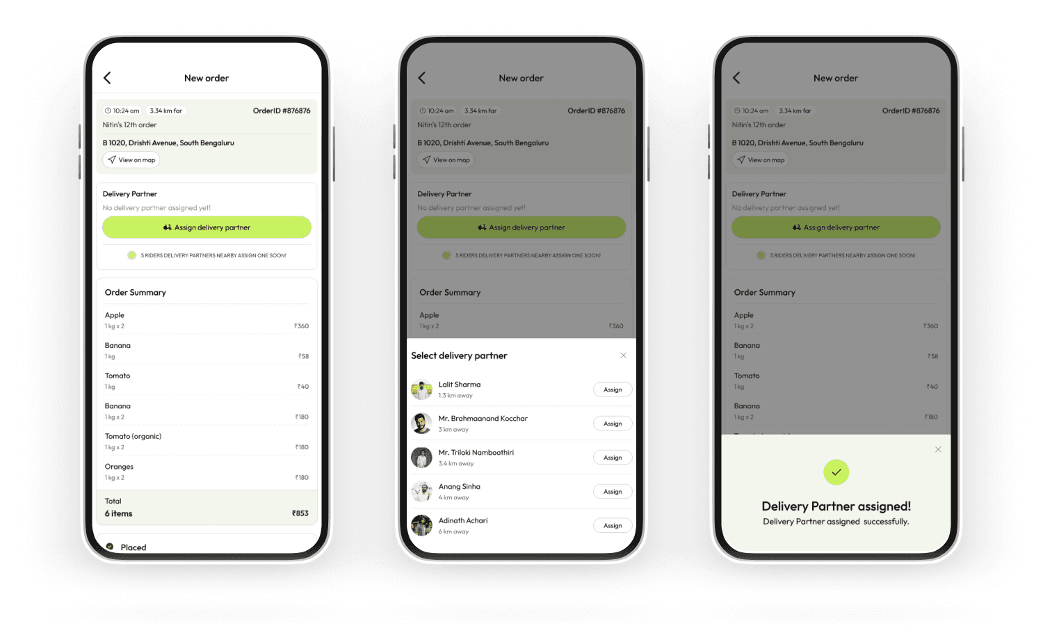 The consumer ordering experience was designed to feel immediately legible to anyone who'd used a quick-commerce app. Splash screen, phone login, browsable categories, search, product detail, cart, checkout. No learning curve, no onboarding tutorial required.