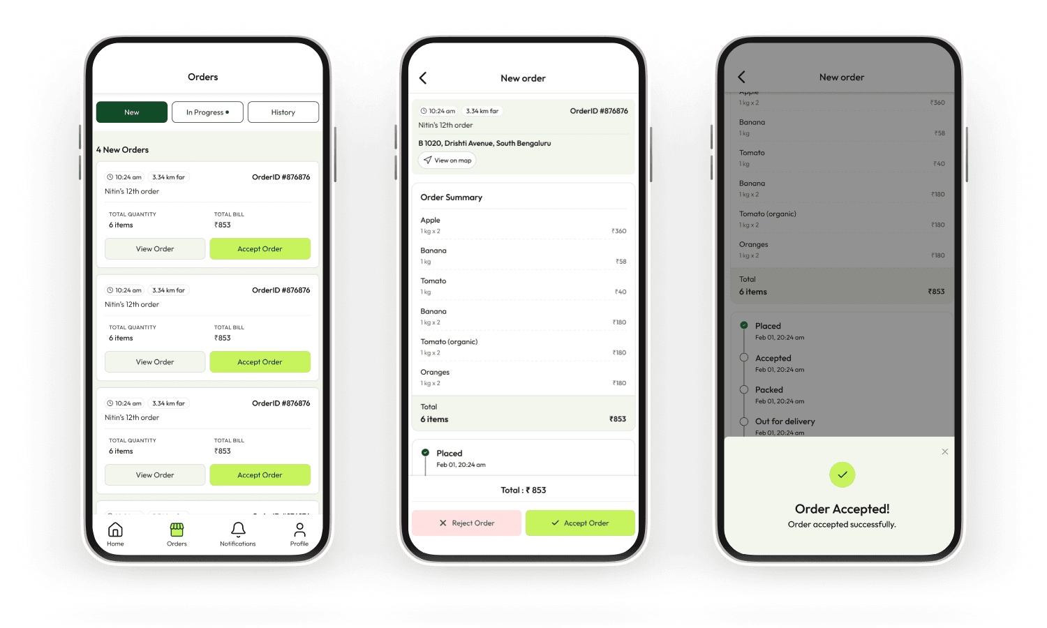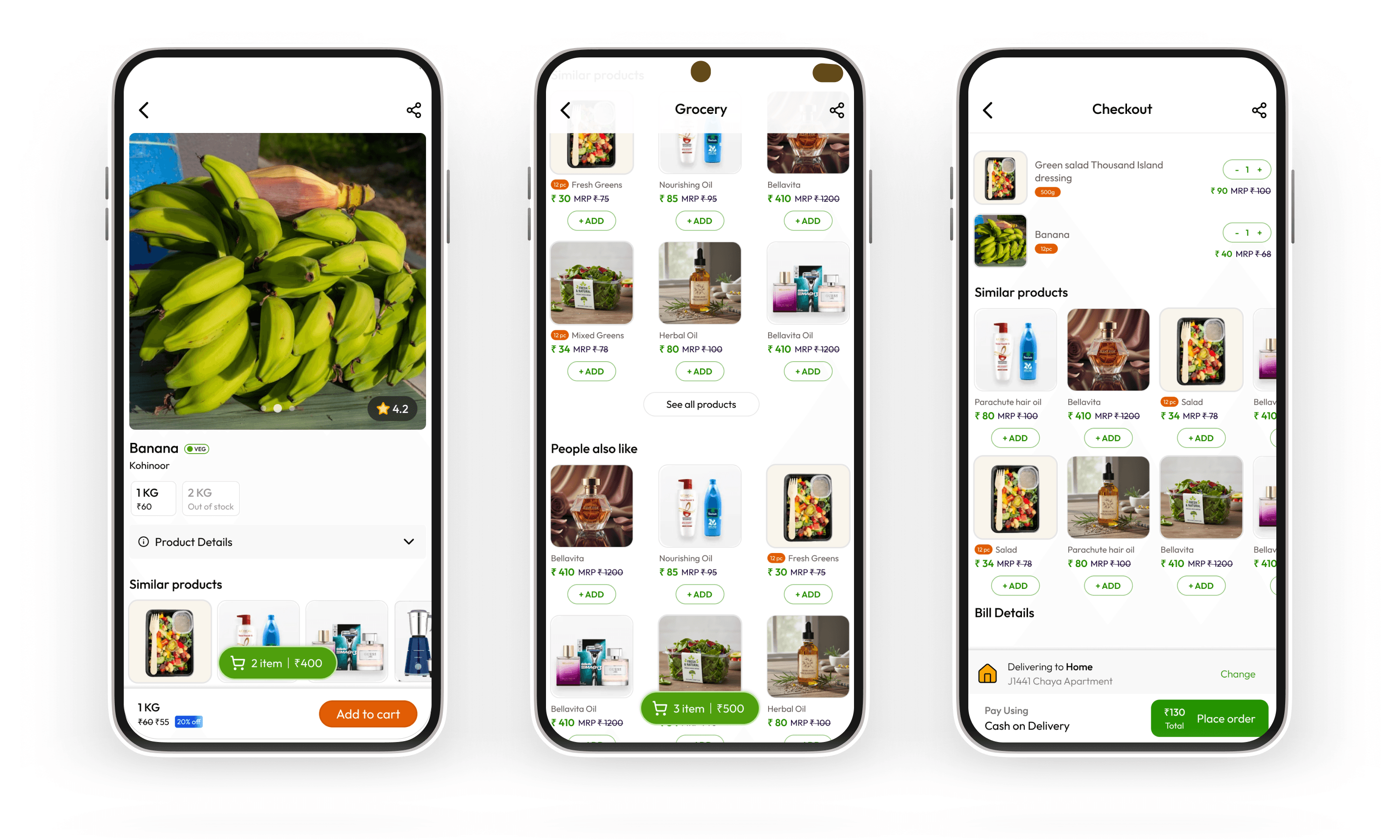 The UI language echoed what users already knew — category icons, product cards with MRP and selling price, add-to-cart affordances, order tracking with live status updates. This wasn't a lack of creative ambition; it was a deliberate choice to reduce the cost of switching.
