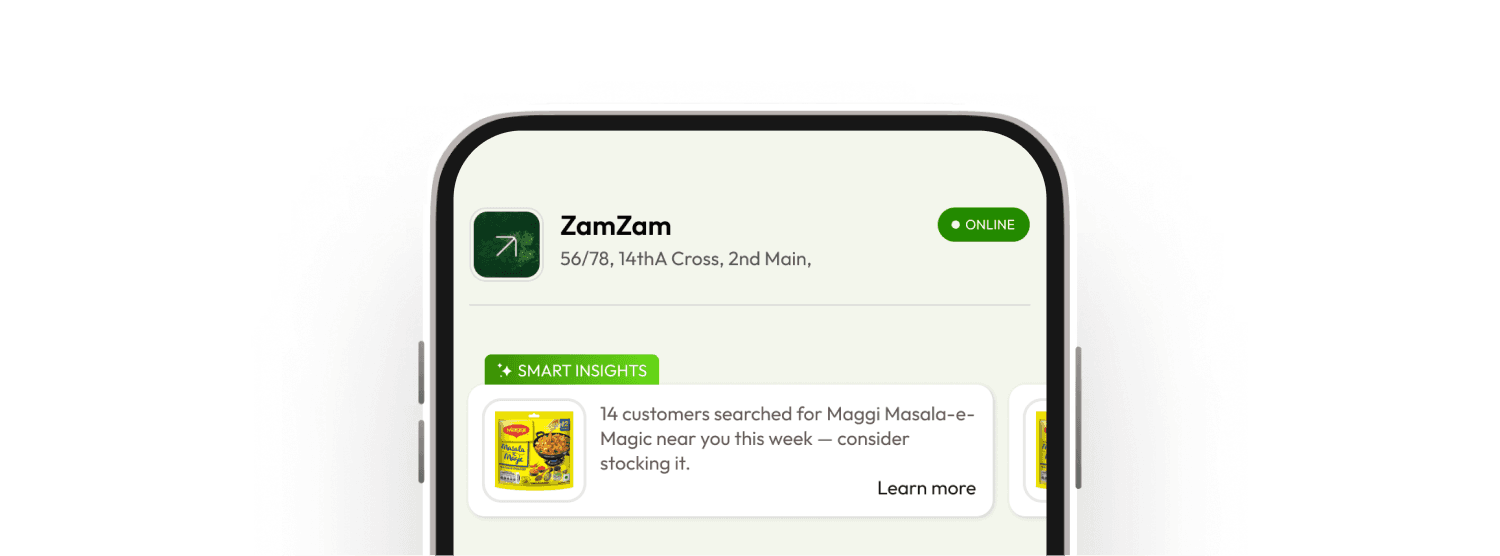 Every time a customer searched for a product a store didn't carry, the system logged the miss. Vendors received aggregated weekly nudges: "14 customers searched for Maggi Masala-e-Magic near you this week — consider stocking it." This turned an operational failure state into a growth signal. It wasn't in the original brief — it emerged from thinking hard about what happens when the app can't help a user.