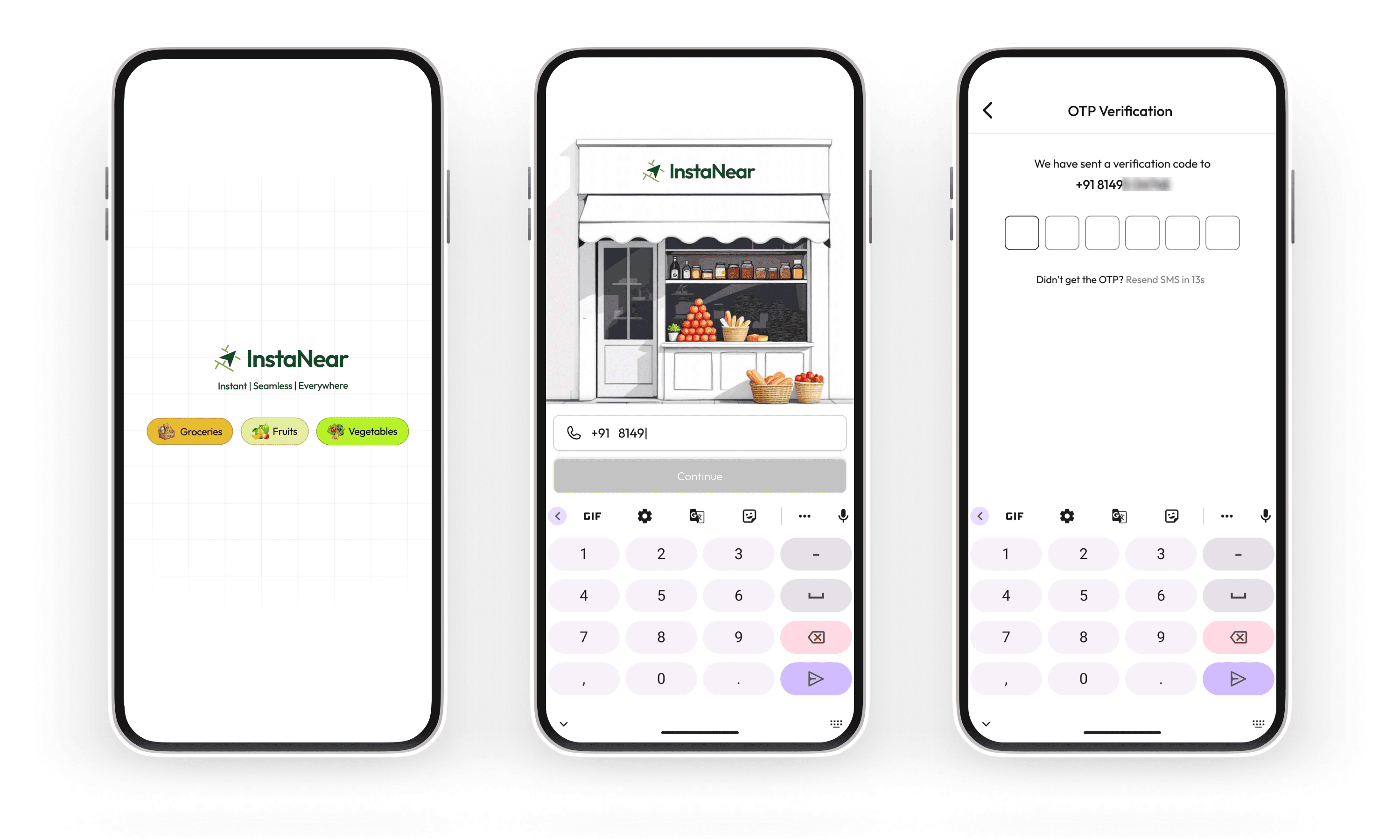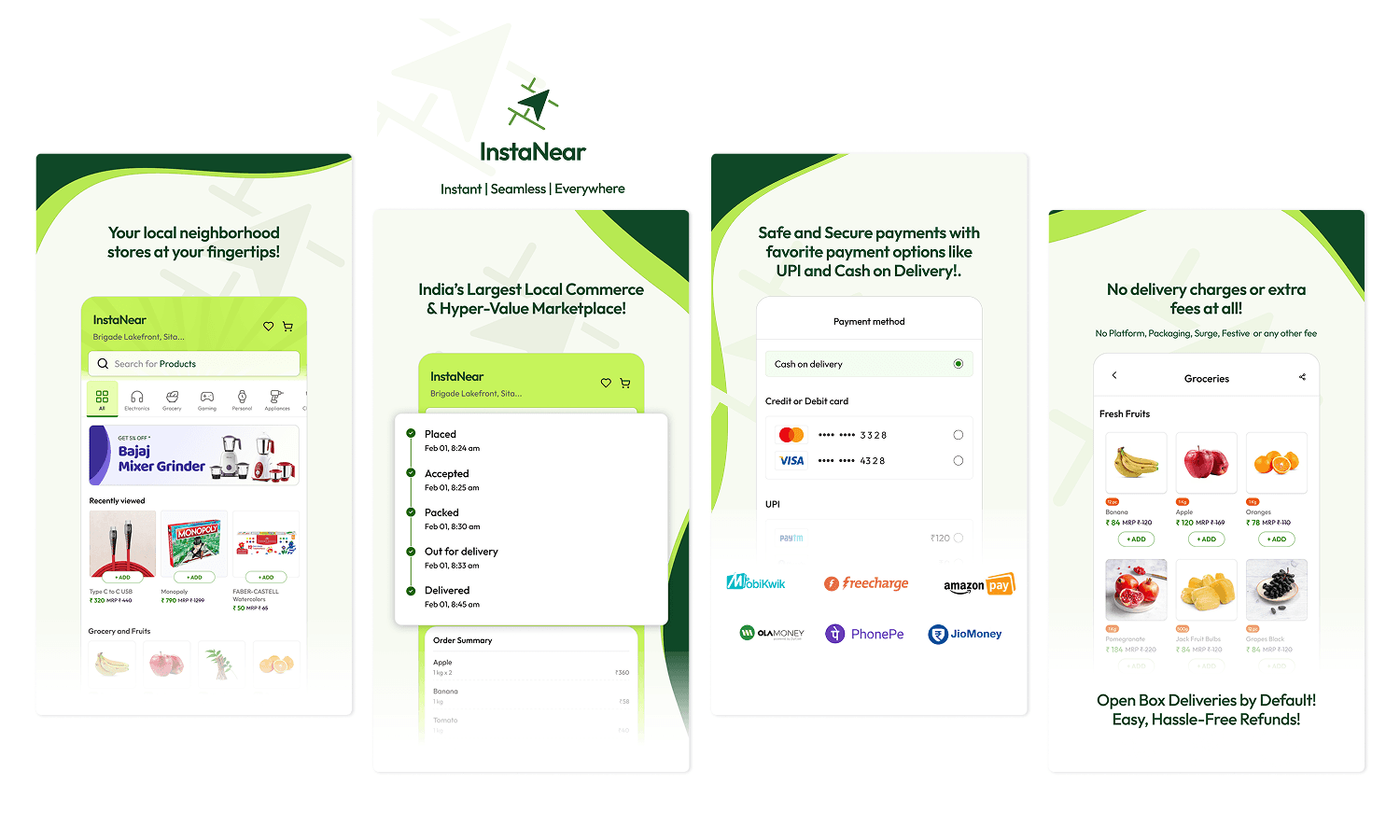 Unlike quick-commerce apps where a pooled anonymous catalogue serves every order, InstaNear let users browse a curated list of nearby stores — their regular chemist, the electronics shop on the corner, the sweet shop they've visited for years — and order directly from a named vendor. The store had an identity. That was the point.